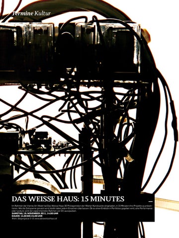 Im Rahmen der Vienna Art Week hat Das Weisse Haus 30 Protagonisten der Wiener Kunstszene eingeladen, in 15 Minuten ihre Projekte zu präsentieren. Wie die Zeitspanne genutzt wird, bleibt dabei jedem Einzelnen überlassen. Ob es einen Einblick in Portfolios gegeben wird, eine Performance oder Lecture wird der experimentelle Rahmen vor Ort ausspucken. Samstag, 19. November.2011, 14.00 Uhr Dauer: 14.00 bis 24.00 Uhr Wien, Geigergasse 5–9; www.dasweissehaus.at