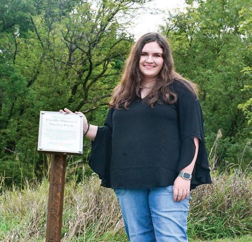 Senior Gabby Burns stands next to a sign reading “Welcome to the Pacific Poetry Path,” celebrating the launch of the new trail featuring local poetry. The trail, part of her IB CAS project, displays poems from both professional and middle school poets