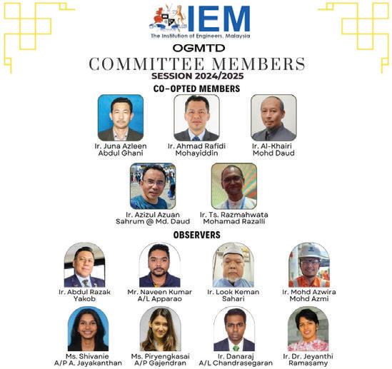 Committee Members: Ir. Lau Tai Onn, Ir. Ong Guan Hock, Ir. Yee Thien Seng, Ir. Ts. Prof. Dr Teo Fang Yenn, Ir. Razmahwata bin Mohd Razalli, Dr Sudharshan N. Raman, Ir. Lee Chang Quan, Ir. Dr Lee Choo Yong, Ir. Begum Irdawati binti Dowlad Rahuman, Ir. Ts. Dr Tan Kim Seah, Ms. Michelle Lau Chui Chui,Grad. IEM, Ir. Ahmad Rafidi bin Mohayiddin
