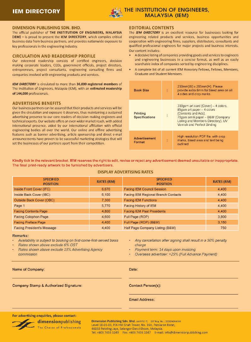 The publicaion has been compiled by both IEM and Dimension with great care and they disclaimanydutytoinvesigateanyproducts,process,services,designsandthelikewhichmay be described in this publicaion. The appearance of any informaion in this publicaion does notnecessarilyconsituteendorsement by IEMand Dimension. Thereisnoguaranteethat the informaioninthis publicaionisfreefromerrors.IEMandDimensiondonotnecessarilyagree with the statement or the opinion expresssed in this publicaion.