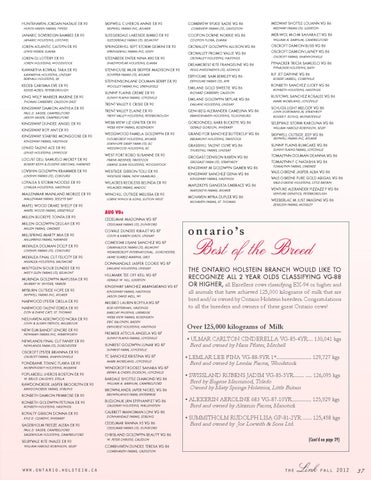 Over 125,000 kilograms of Milk • ULMAR CARLTON CINDERELLA VG-85-4YR.... 130,041 kgs Bred and owned by Hans Pfister, Mitchell • LEMLAR LEE FINA VG-88-9YR 1*........................... 129,727 kgs Bred and owned by Lemlar Farms, Woodstock • SWISSLAND RUBENS JADIM VG-85-5YR........ ..... 126,095 kgs Bred by Eugene Merminod, Toledo Owned by Misty Springs Holsteins, Little Britain • ALEXERIN AEROLINE 683 VG-87-10YR............... 125,929 kgs Bred and owned by Alexerin Farms, Manotick • SUMMITHOLM RUDOLPH LISA GP-81-2YR ....... 125,458 kgs Bred and owned by Joe Loewith & Sons Ltd.