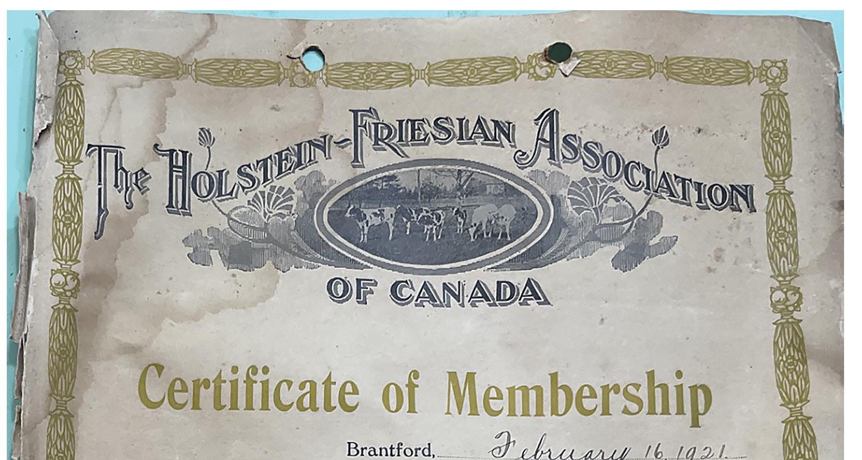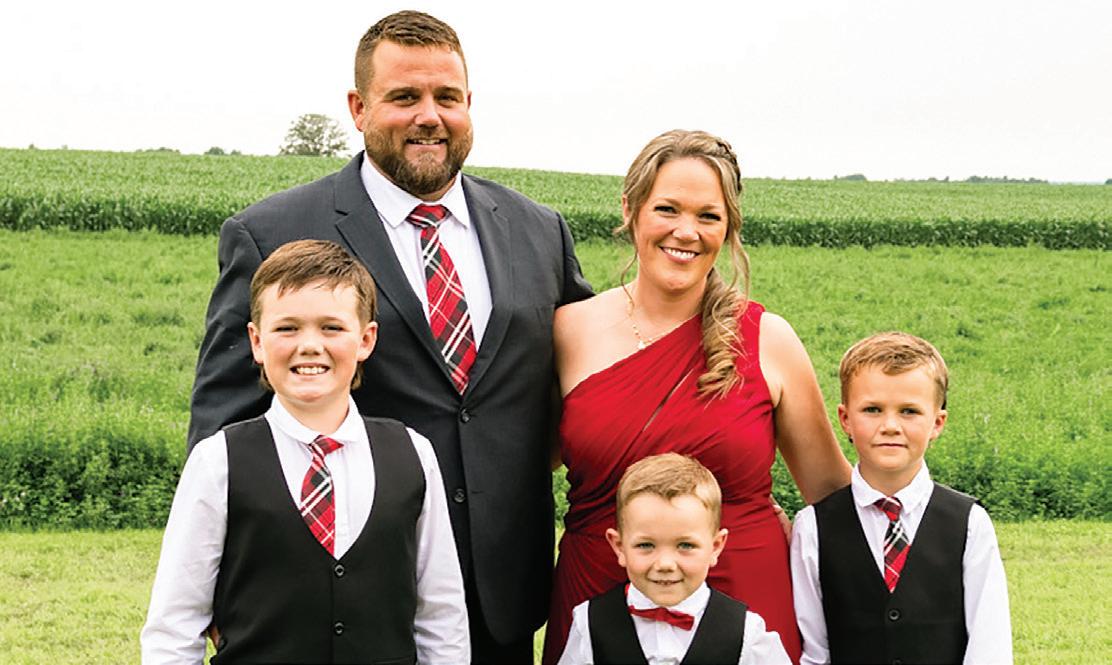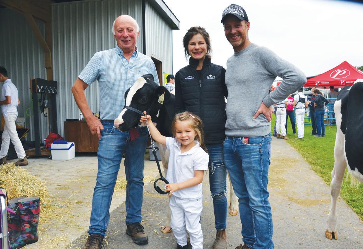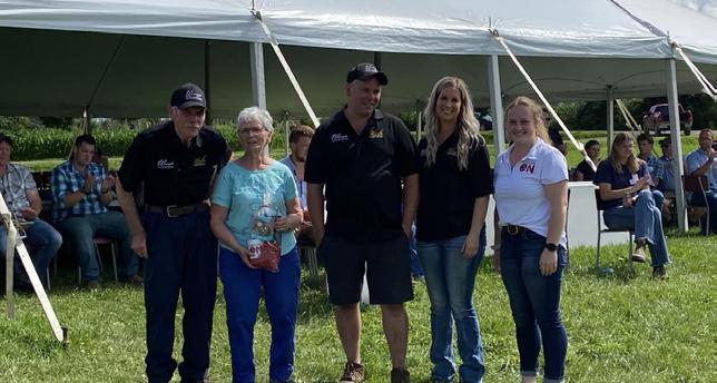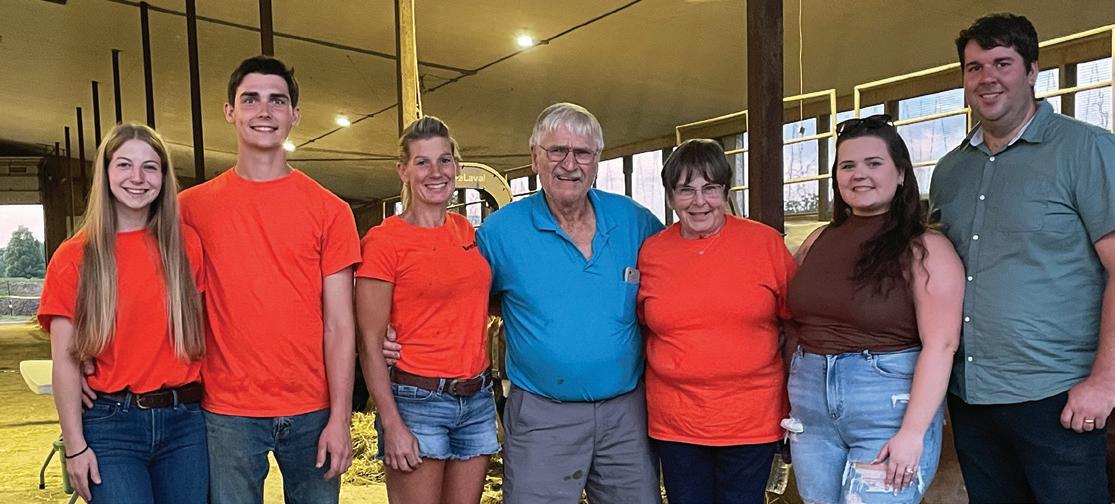 PHOTOS 1. Bertram Stewart (right), a founding member of the Ontario Dairy Youth Trust Fund and Trustee until his passing in 2018, presenting a platinum level donor certificate to Phyllis MacMaster. 2. From left to right, Chloe Grabell, Matthew Roszell, Brenda Roszell, Don and Linda Green, Emma and Jimmy Yungblut of Feederlane Holsteins at Niagara Dinner at the Dairy in 2023 3. The 2021 Inter-County Judging Team touring Hoards Dairyman Farm in Madison. From l to r: Matthew Roszell, Lexi Johnston, Alex McKay, and Cally Finley, 4. Amanda Cowan, 2020 Dairy Youth Award Winner with her husband, Tyler Cowan, and their 3 sons. PHOTOS SUBMITTED.