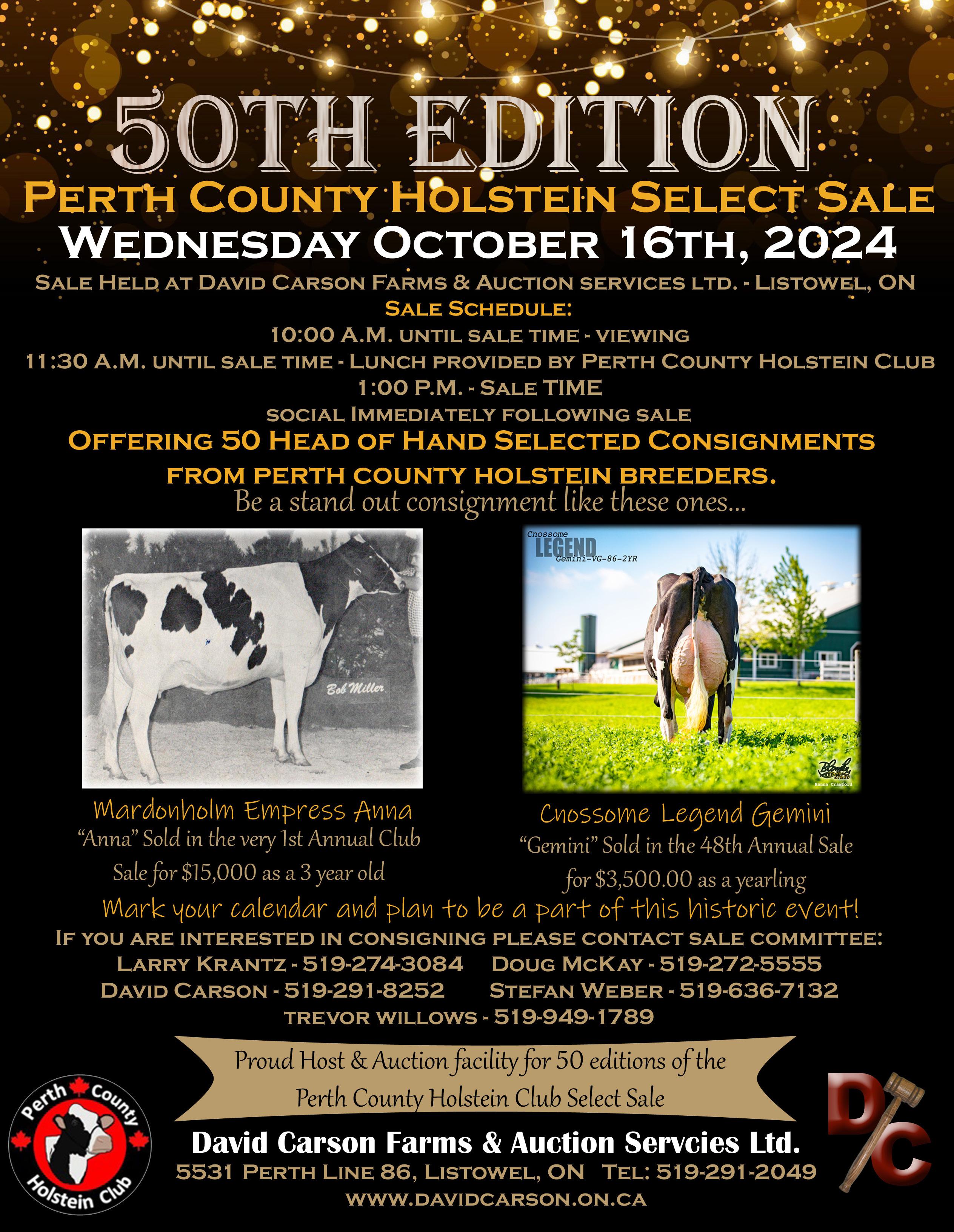 TThe Perth County Club Select Sale will mark its 50th sale on October 16, 2024. Since 1975, the Perth County Club Select Sale has been held at David Carsons Farms and Auctions, offering top consignments from perth county each year. The Perth County Holstein Club is excited to showcase the history that has contributed to 50 years of successful sales.