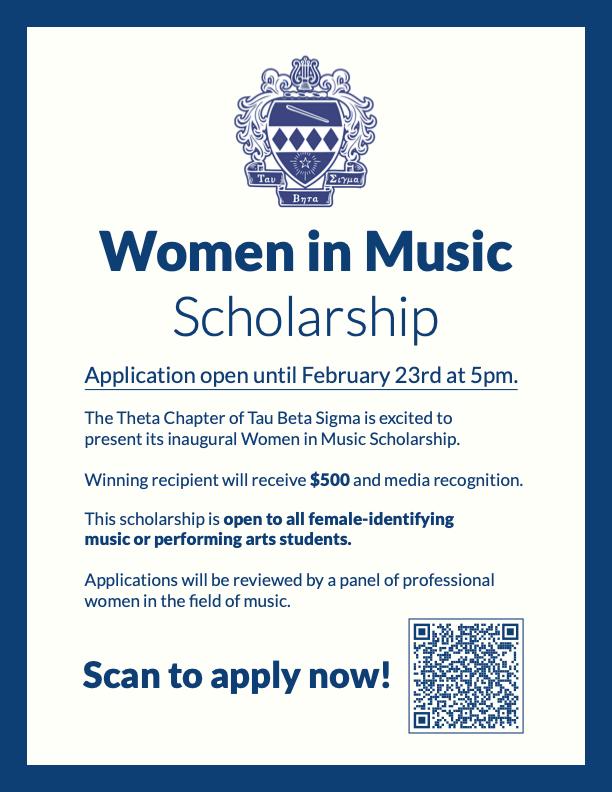 The Theta Chapter (est. 1947) of Tau Beta Sigma (ΤΒΣ) has had a long history, and recently, we have been able to add a wonderful addition to our chapter legacy. In the Fall of 2021, our chapter took time to focus on our internal operations and consider the direction and focus of Theta. On November 14th, we determined that we wanted to place a higher focus on music and thus decided to elevate our Music Chair position to Music Director, a title finally solidified in our records in 2023. With this role, we also established a Music Committee they would oversee as an executive officer. Shortly after this shift, in the Spring Semester of 2022, one of the committee’s focuses became developing a Women in Music (WIM) Scholarship. This scholarship idea was worked on over the next year, but never fully developed until this past academic year when planning finally got off the ground and the project was realized for the first time.