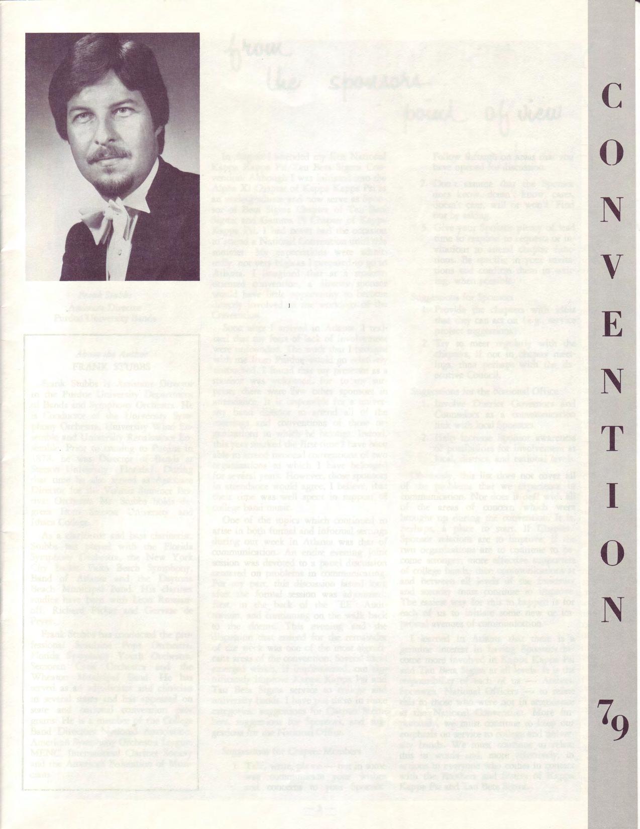 In August I attended my first National Kappa Kappa Psi/Tau Beta Sigma Convention. Although I was initiated into the Alpha Xi Chapter of Kappa Kappa Psi as an undergraduate and now serve as Sponsor of Beta Sigma Chapter of Tau Beta Sigma and Gamma Pi Chapter of Kappa Kappa Psi, I had never had the occasion to attend a National Convention until this summer. My expectations were admitredly, not very high as I prepared to go to Atlanta. I imagined that at a studentoriented convention, a director/ sponsor would have little opportunity to become directly involved in the workings of the Convention.