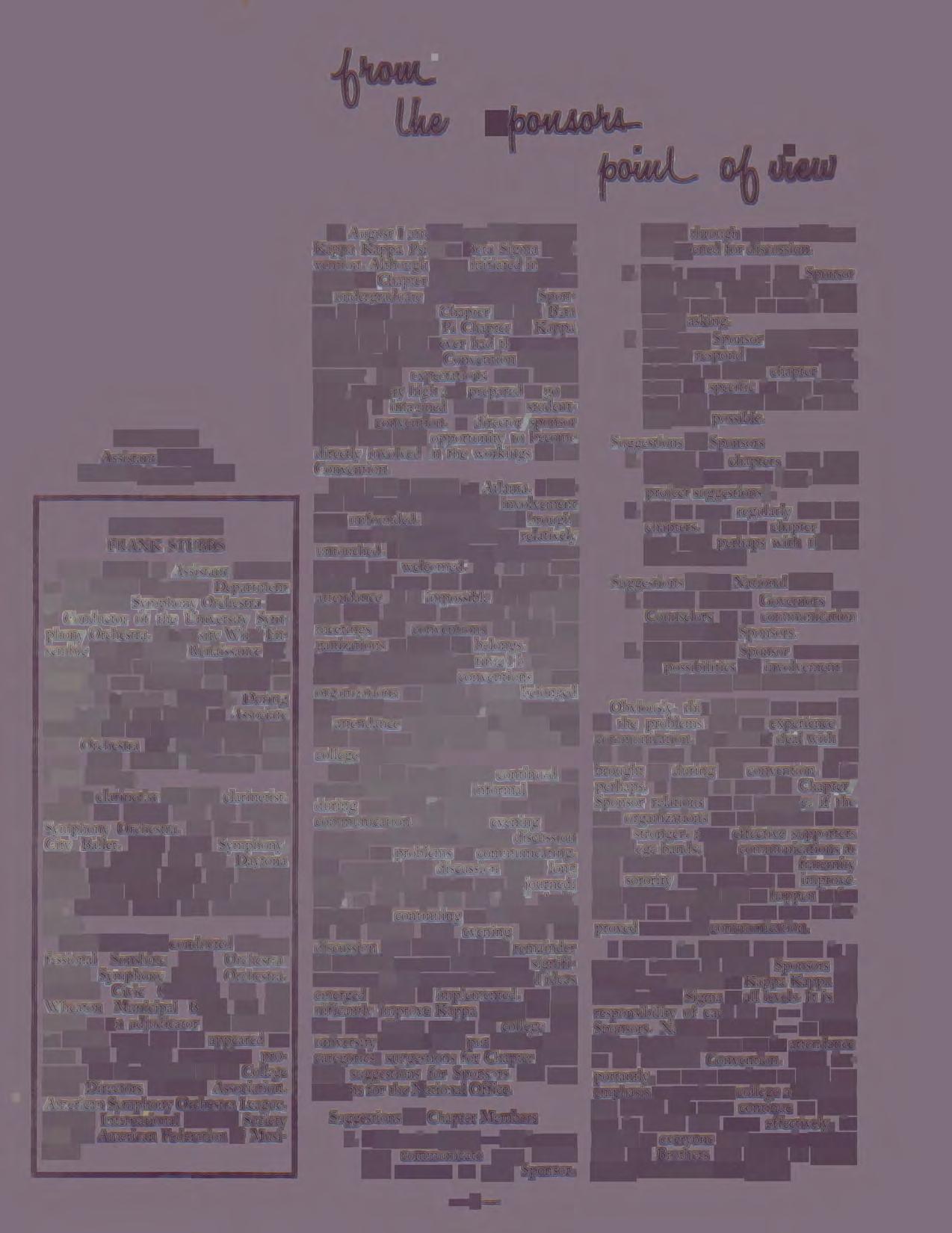 enmum. -A workshop session early in the convention week concerning chapter/ sponsor relations stirred much comment and must continue to be discussed constructively. -Participation in the NIB's was greater than at previous conventions and the quality of both bands reflected this participation and enthusiastic support. Dr.