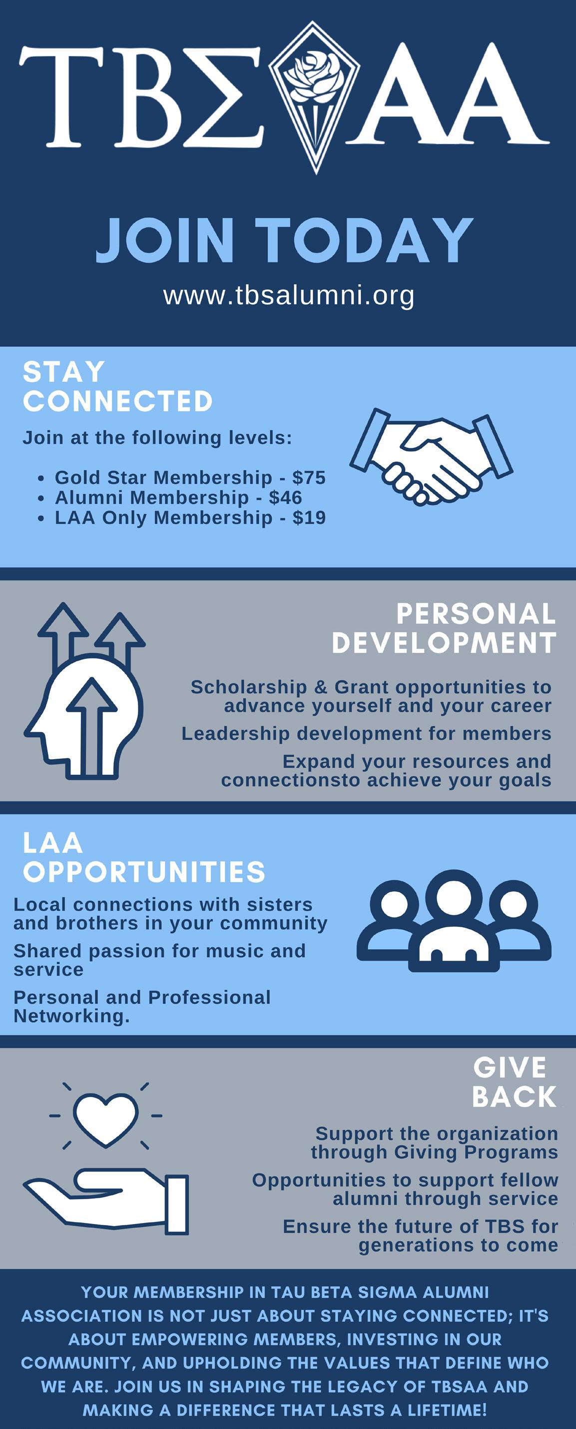 The Tau Beta Sigma Alumni Association invites you to take part in exciting upcoming opportunities that recognize outstanding alumni, support lifelong learning, and promote service through music. These initiatives are a great way to connect with fellow alumni, engage with the mission of Tau Beta Sigma, and serve our community in meaningful ways. More information can be found at www.tbsalumni.org.