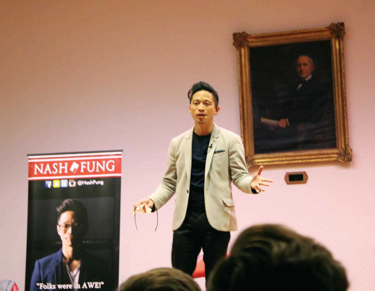 Fung told several stories from his life that he used as inspiration for some of his tricks. As an immigrant from Hong Kong, China who moved to the United States, Fung felt like he did not fit in with the culture. After he realized his insecurities were all in his head, he came to embrace being different. He then pulled two students onto the stage, blindfolded them and asked them whether they were either drinking orange juice or apple juice. Both students had a different answer when they were actually just sipping water. Fung explained that changing our perspective is powerful enough to convince us of almost anything.