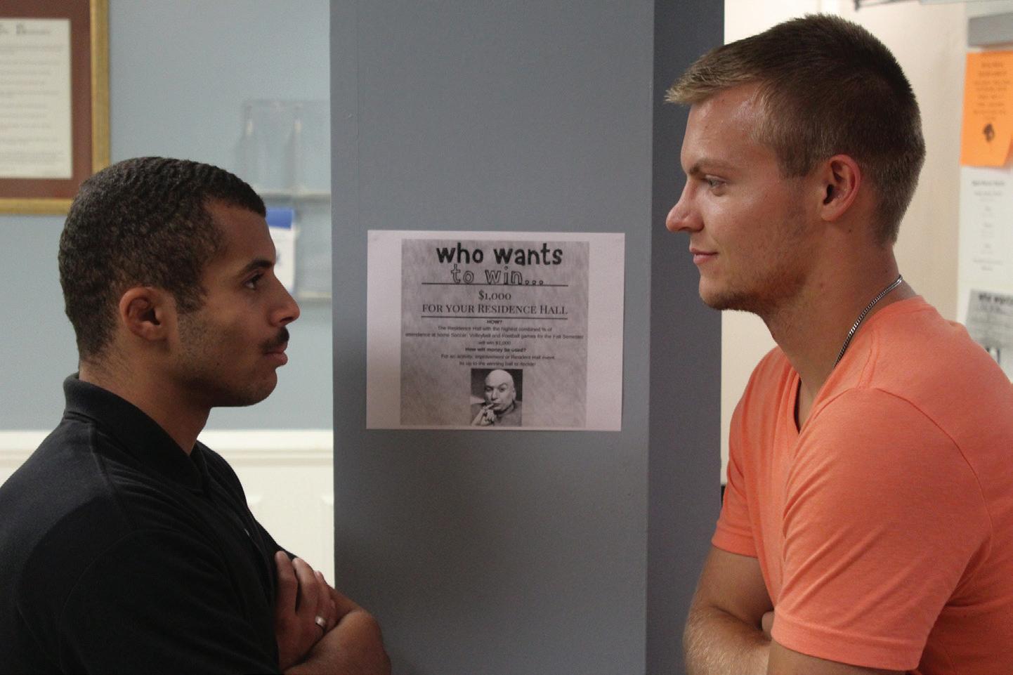 Devon Goings, student l ife Assistant for r ob-Cook Hall, faces off with Danny enge, s enior r A of Mahan Hall, in front of dorm competition poster.
