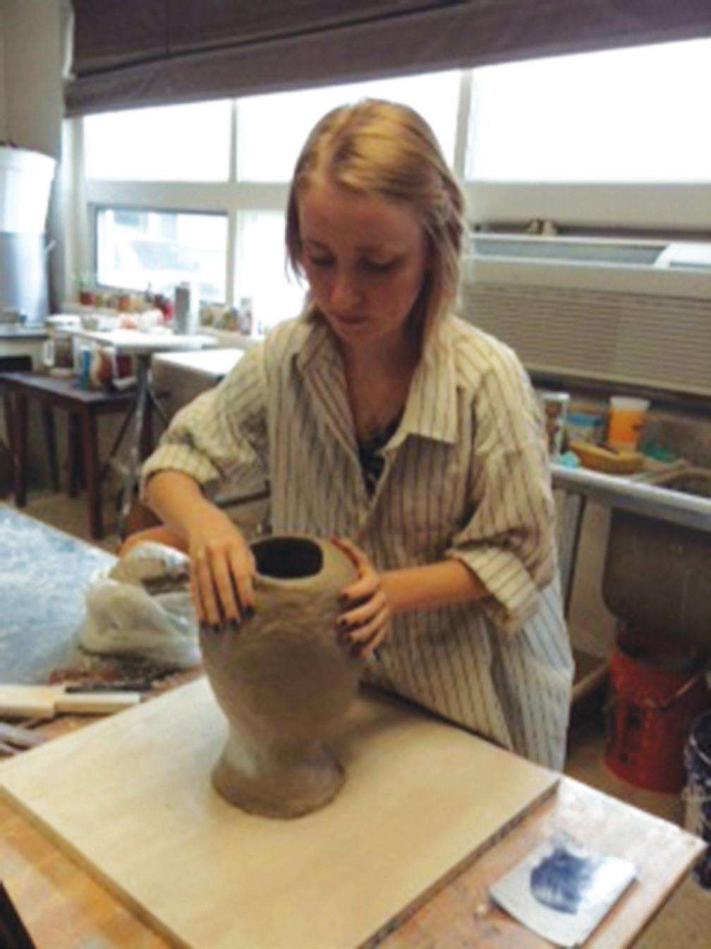 A 25-pound bag of clay is thrown onto the table in front of the artist. The artist carefully plans and draws an idea of what the lump of clay will become. Depending on which technique of sculpting the artist chooses, they either move the clay around to form a shape or cut off chunks of clay to roll into coils to stack on top of each other.