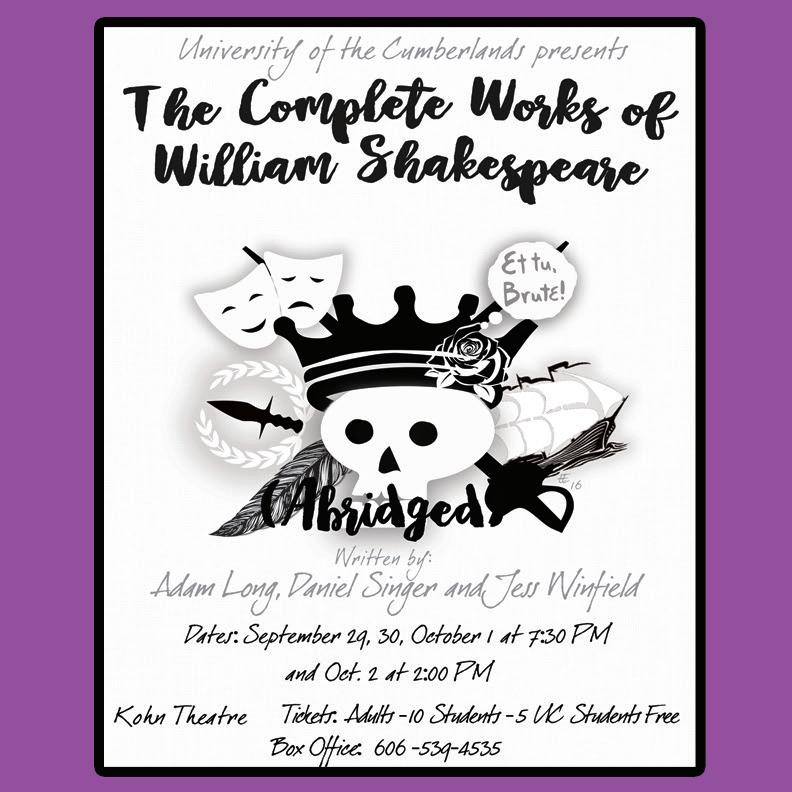 This fall semester the University of the Cumberlands theatre department will be performing the play “The Complete Works of William Shakespeare (Abridged).” The title of the play may have you thinking, “Do I really have enough time to watch every Shakespeare play?” The answer is yes. “The Complete Works of William Shakespeare (Abridged)” was originally written and performed by a theatre group known as The Reduced Shakespeare Company and is about three men (played on campus by UC students Nick Kidd, Foster Colvin and Austin Fletcher) who will attempt to perform all 37 of Shakespeare’s plays within the evening. Imagine for yourself all of the hours of content that was written by Shakespeare crammed into a 2-hour block.