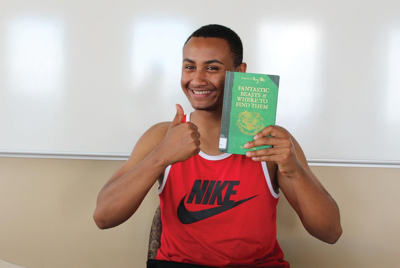 UC student Zeke Bishaw poses with J.K. r owling’s book, “Fanastic Beasts & Where to Find Them.”