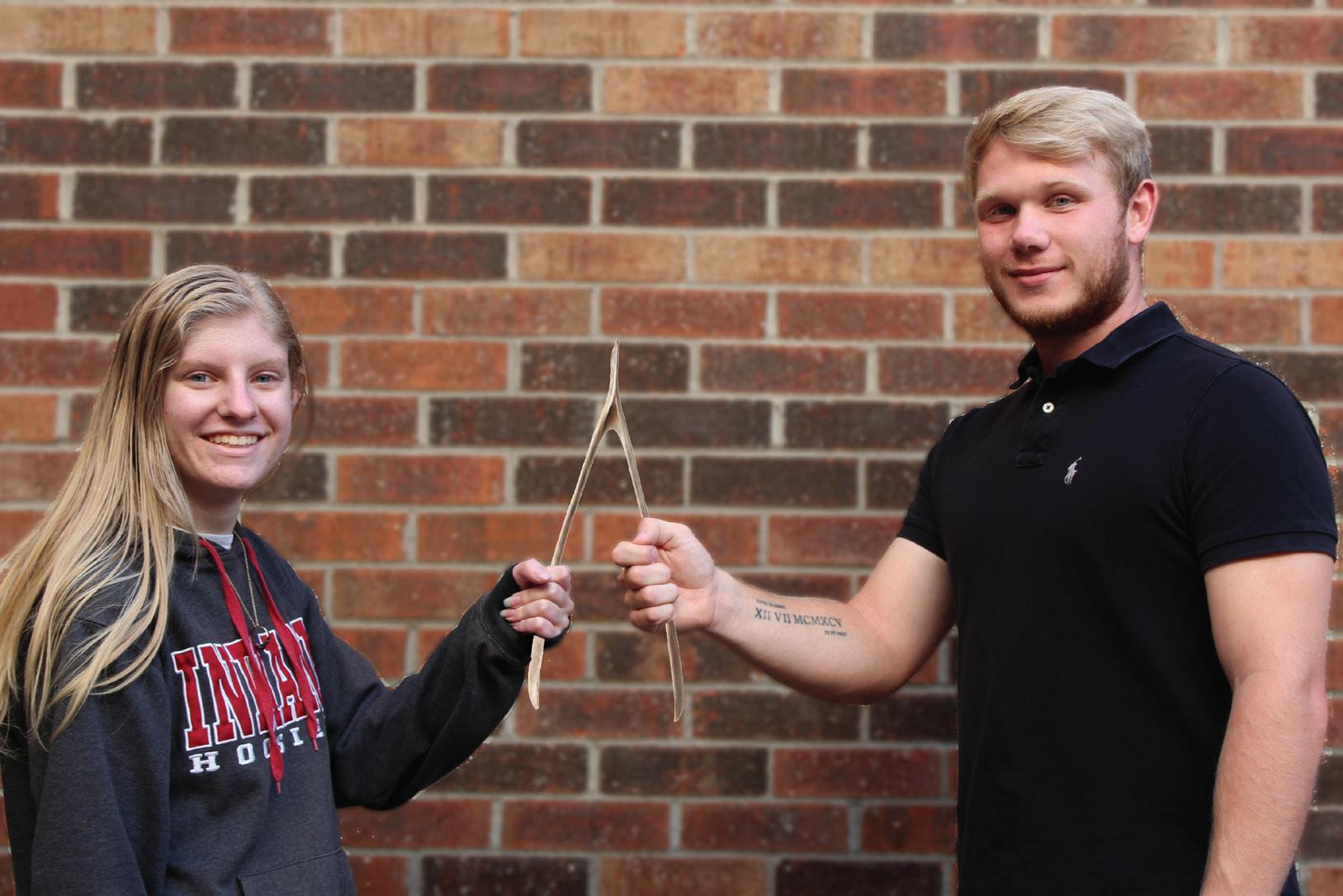 Faith Titus (left) and Nicklas Nancke (right) split a wishbone as part of the Thanksgiving tradition.