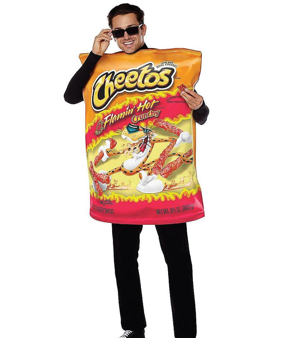 I donât know whose idea these costumes were, but these are an abomination to my eyes. Spirit Halloweenâs âFlaminâ Hot Cheetosâ and âFlaminâ Hot Cheetos Bagâ costumes are something Iâd never thought Iâd see made into a costume. You could buy one of these for just you or double them up as a couplesâ or a best friendsâ costume, either way, theyâre both terrible ideas. The idea of spending $39.99 to look like a Cheeto or wear a giant Cheetos bag as a costume sounds like Iâm basically throwing two twenties down the drain. A pair of sunglasses does come with each costume, which seems to be the only âproâ of getting either of these costumes.