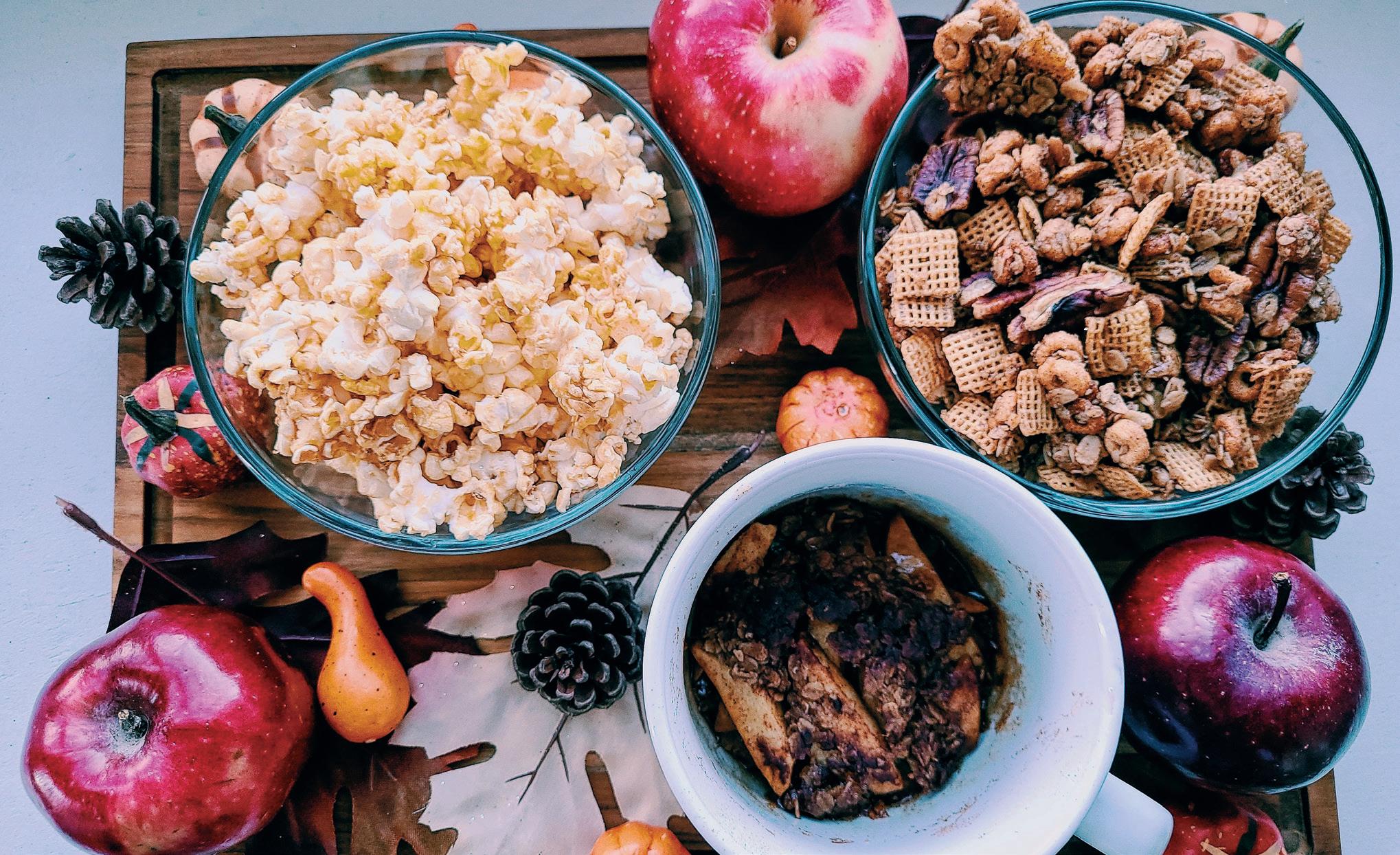 Caramel popcorn, apple crisp in a mug, and pumpkin spice trail mix âthese three dorm-friendly, microwavable recipes are unbe-leaf-ably easy and are sure to have your taste buds falling in love with some of the most popular flavors of the season! First on the menu is the caramel popcorn!