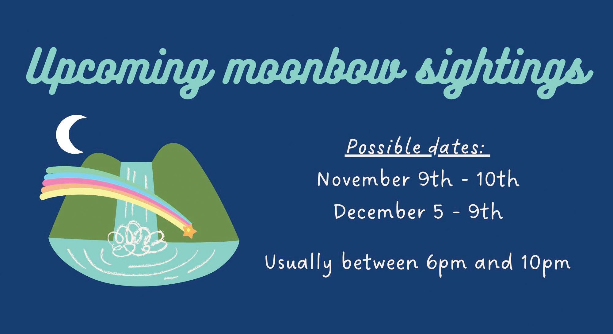 Who would have thought that Kentucky was the home of a natural phenomenon? The moonbow at Cumberland Falls is an incredible sight, and it is only half an hour away from our little town of Williamsburg! If you are not sure what a moonbow is, it is a rainbow that occurs at night and reflects the moon instead of the sun. Cumberland Falls is one of the only places in the United States where you can view a moonbow. According to the Kentucky State Parks website, Cumberland Falls has a moonbow multiple days every month, providing many opportunities for people to view one. Entering Cumberland Falls State Park is free, so no fee is required to view the moonbow.
