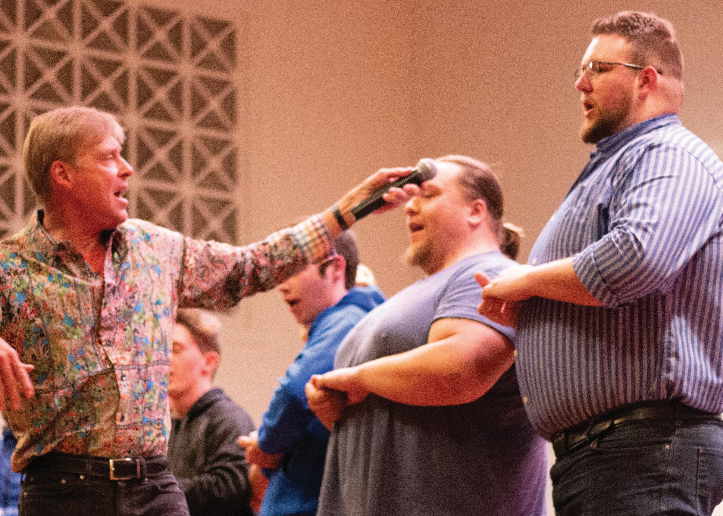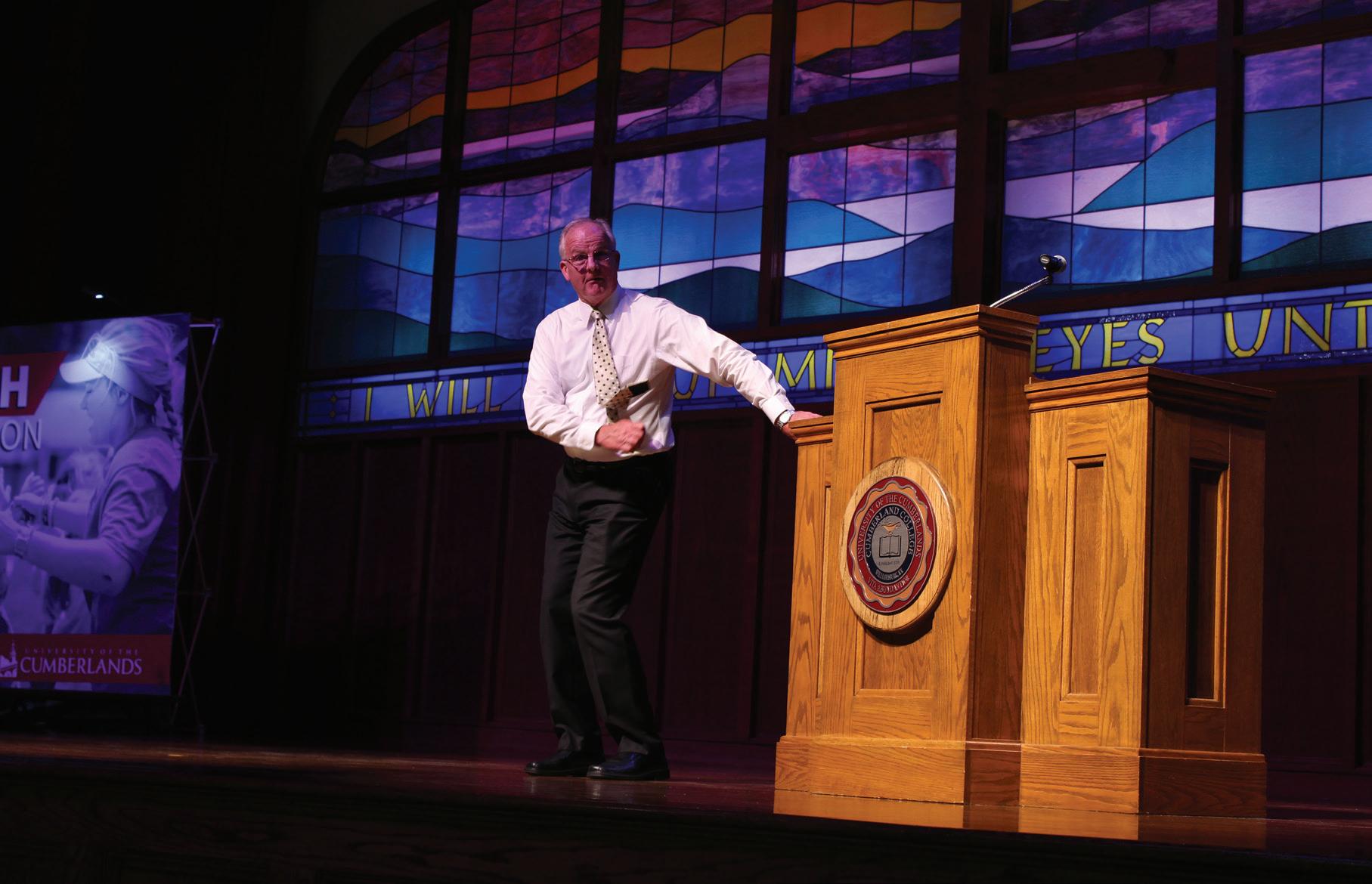 President Cockrum flosses during opening convocation.