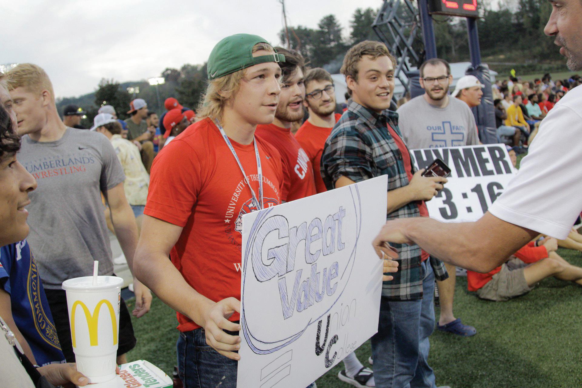 Freshman wrestler Harrison Brooks holds a sign ridiculing Union College at a home football game . The university held a contest for best signs at the game .