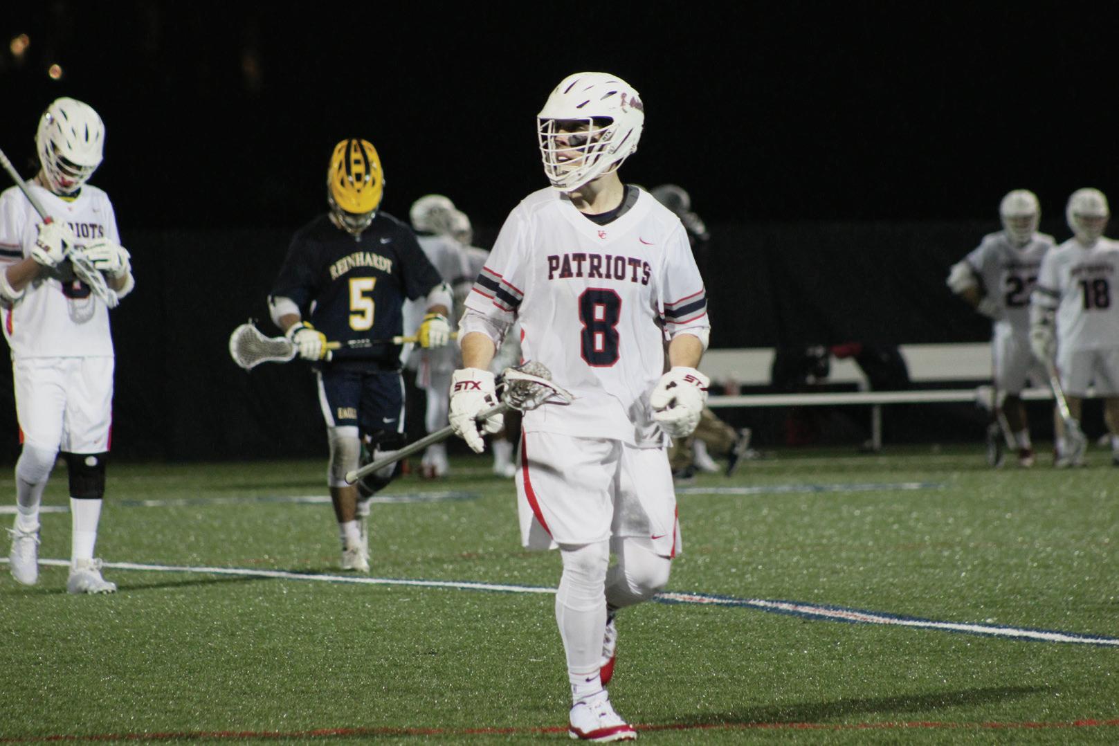 Nick Difranco, a 2019 graduate, looks for a open pass during the men’s lacrosse historical win over Reinhardt University