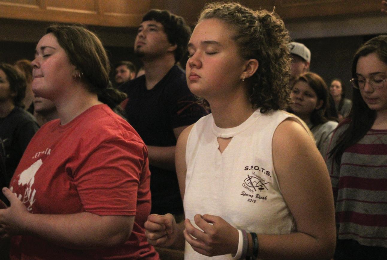 Two students close their eyes during prayer at campus worpship at Gatliff Chapel.