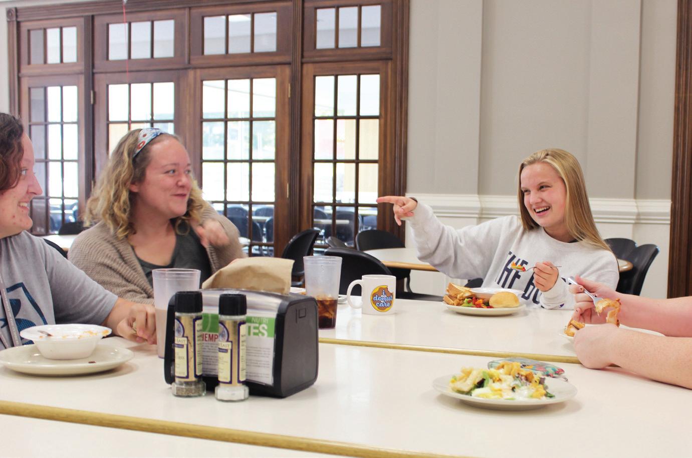 Students Amanda Gault and Cassie Pointer enjoy their time while dining in the cafeteria.