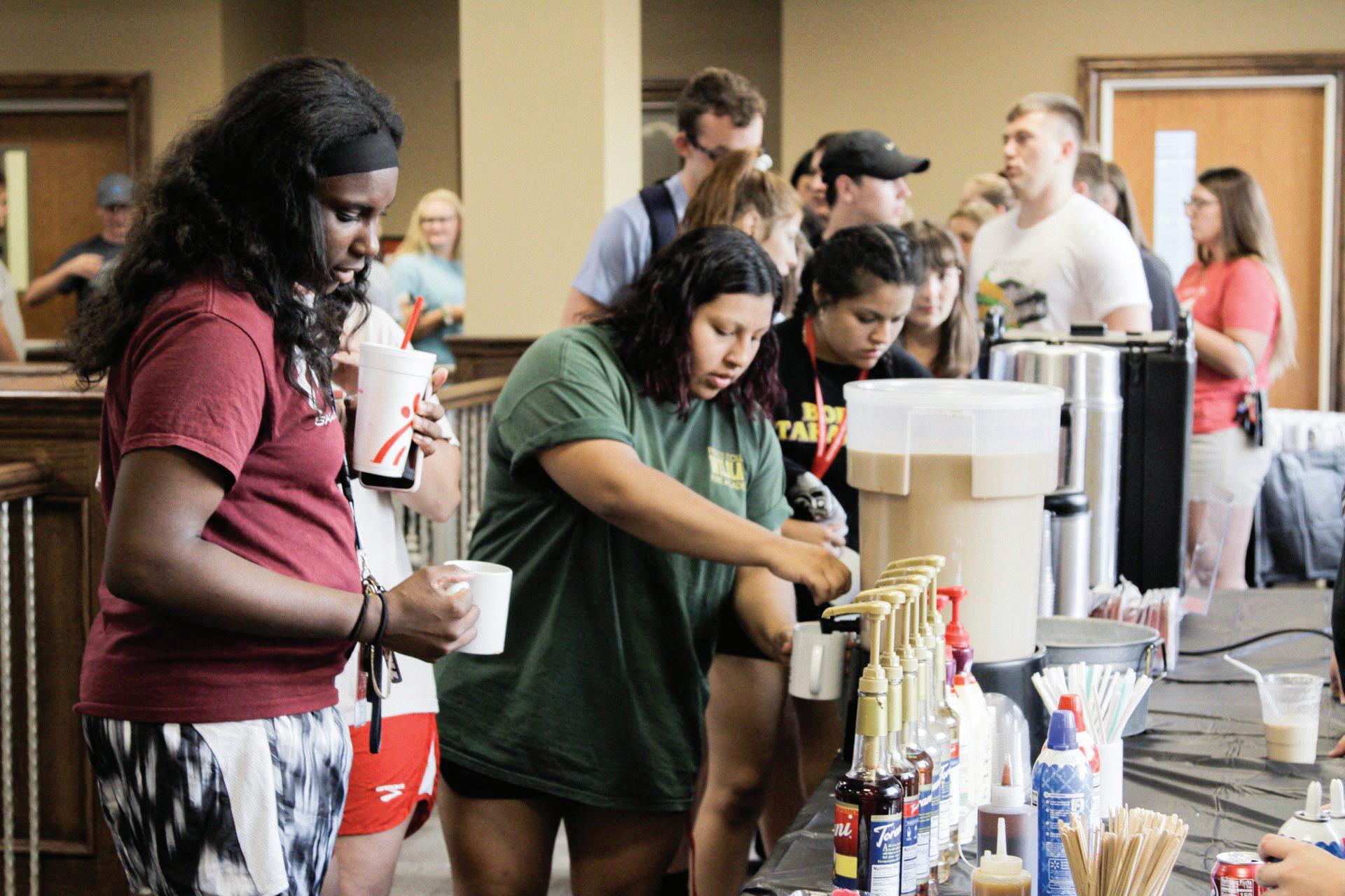 Students gather to get their free mugs and enojoy some coffee.
