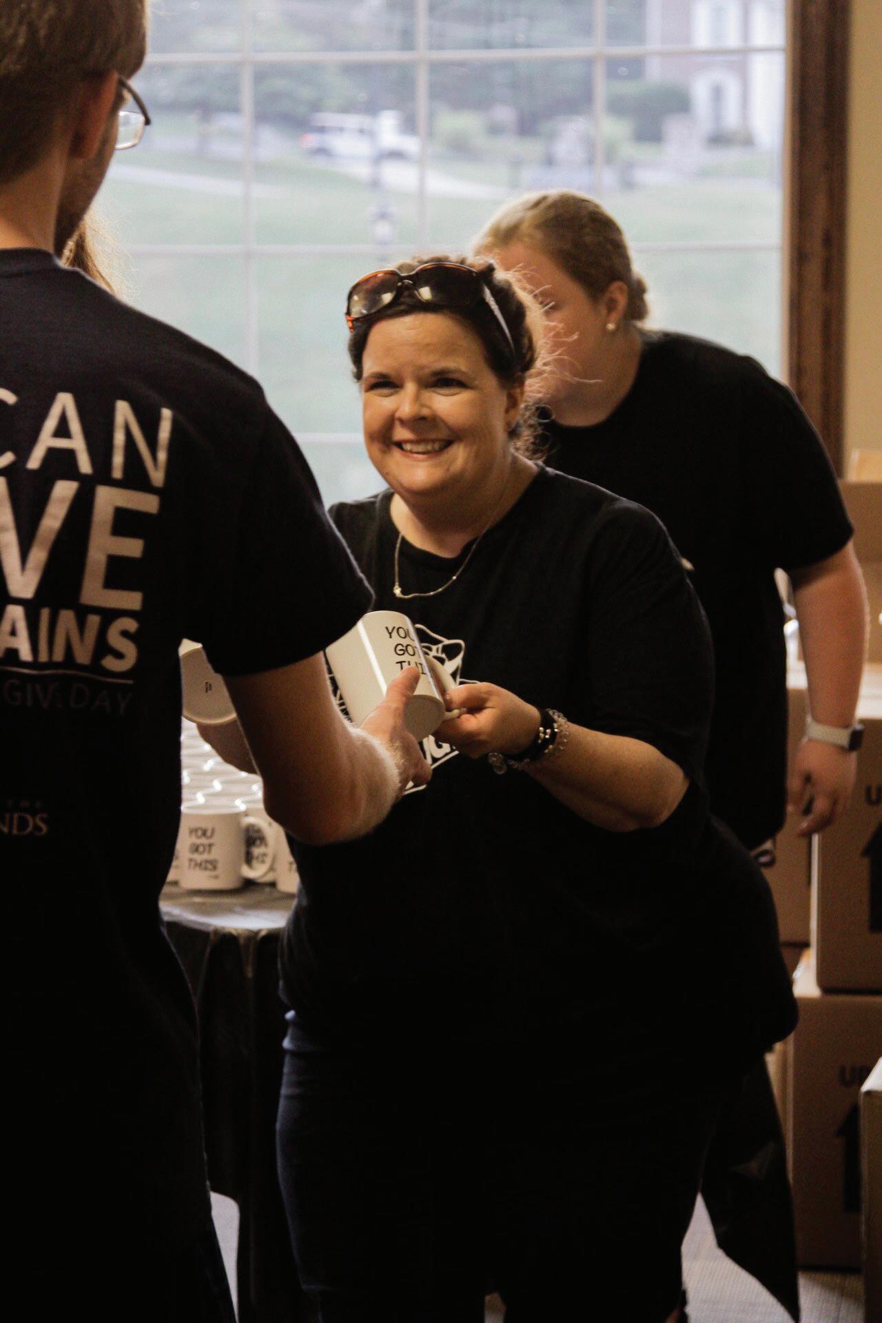 Lisa Bartram, head of CAB, passes out coffee mugs for the yearly coffeehouse event.