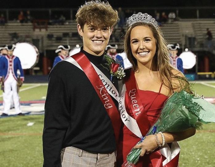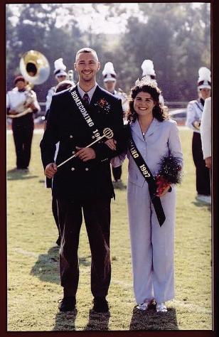The 1997 homecoming king and queen, Stephen Brown and Carlee Ballard, escorting each other on the field.