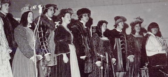 1974 choir participating in Madrigals. The choir dresses up as a medieval court and perform music relevant to the medieval era.