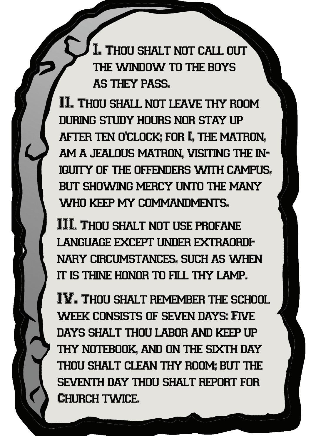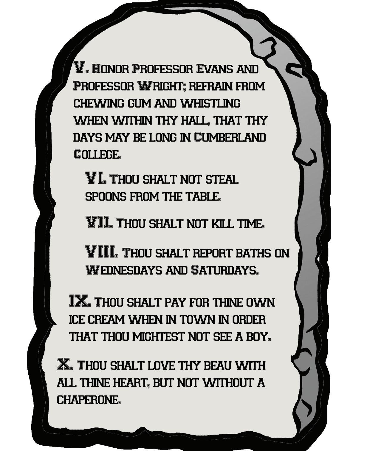 In January of 1921, University of the Cumberlands was just a fledgling college aiming to be a university We were still called Cumberland College, the paper was still called “The Cumberland College Echo”, and spoon stealing, as I understand it, was an epidemic. At least that is how it appeared when the January 26, 1921 issue of The Echo released a list of Ten Commandments for Cumberland women. There was a time when men and women were even more strictly watched, a time when the women had a matron to watch over them and keep them all in line, a woman named McConnell Here are the ten commandments, as originally published in The Echo.