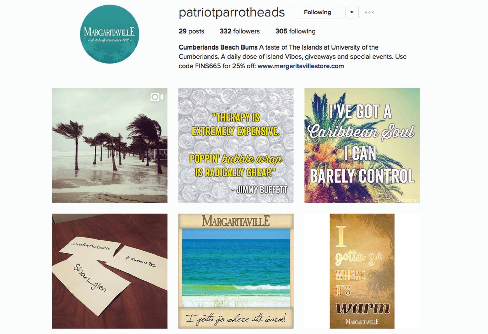 The account also features giveaways of Margaritaville products such as “Fins Up!” stickers and coupons that can be used at the Margaritaville stores or restaurants.