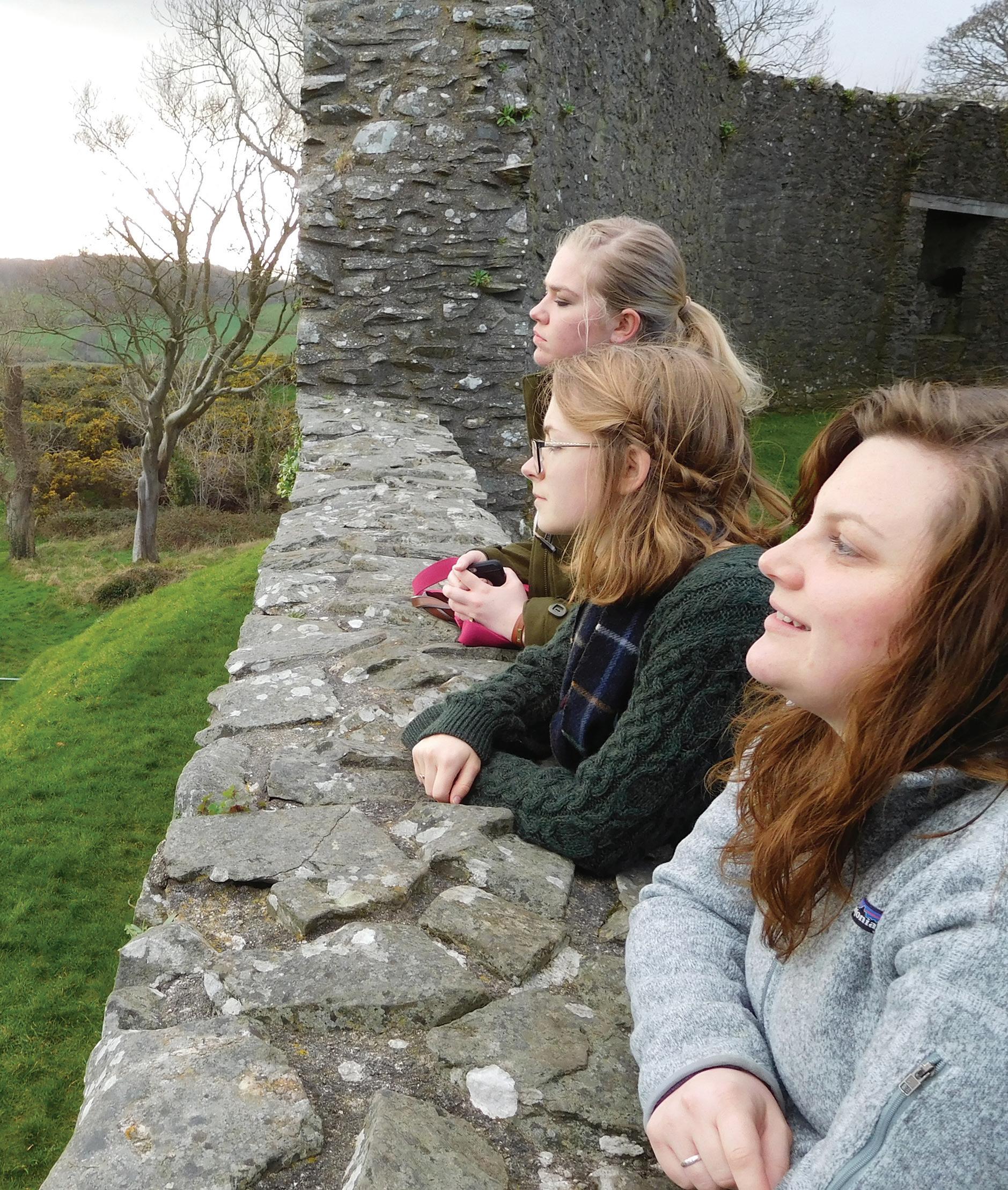 Photo Above: Jasmine Newport, team leader, director of Appalachian Ministries and associate campus minister, prays for the people of Northern Ireland along with the rest of the team at Dundrum Castle March 11. Front to back: Newport, Katie Herrington, and Caitlyn Howell.