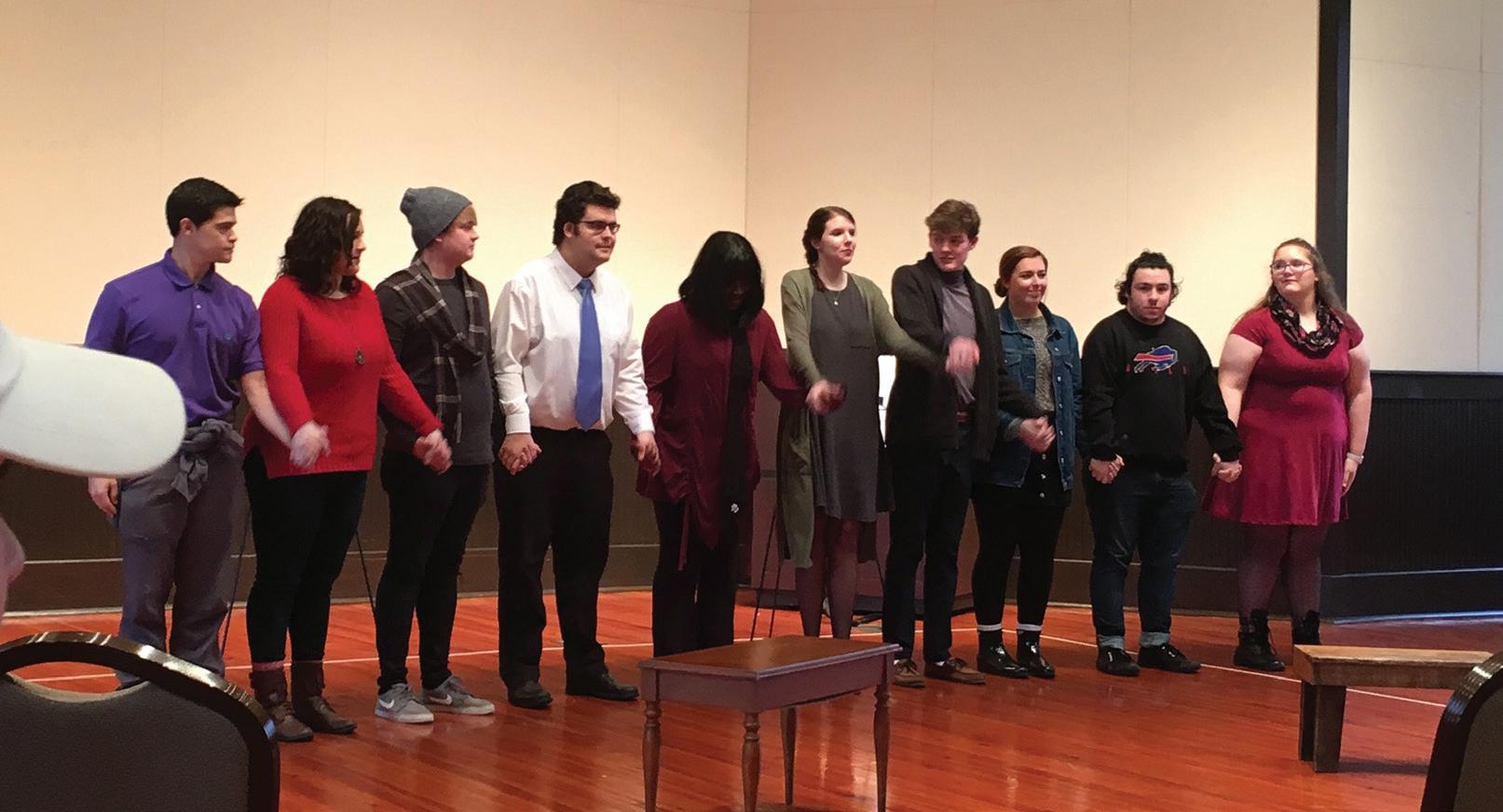 On February 7, 10 members of the Patprovs, the campus improv troupe, and UC theatre professor Dr. Kim Miller set off in a 15-passengervan. Our destination: Americus, Georgia and the Region IV Kennedy Center American College Theater Festival. The KCACTF hosted schools from all over the region to practice, perform, and showcase the different skills and styles of theatre, including the devised theatre piece that we prepared. Devised theatre is a type of theatre created by a group for that group to perform. It can be anything from a dramatic thought piece on the injustices of the times to a witty commentary on the hilarity of pop culture. It can also take many forms.