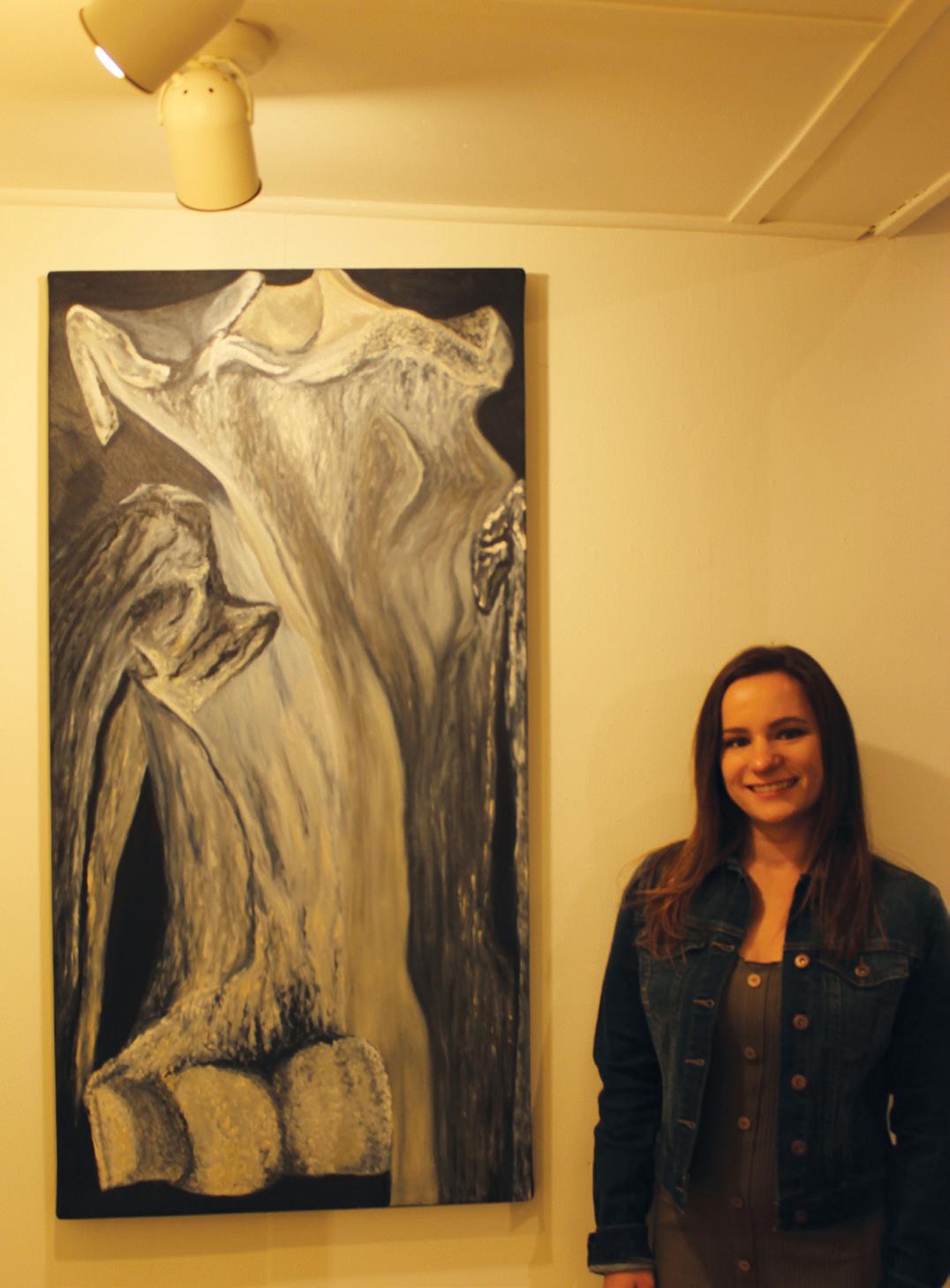 Draneâs other piece that was really eye-catching was âDepth.â This piece took the most amount of time because she had to let every layer dry so she could put more details in. Drane says, âBeing a painter, Iâm a nerd with all art. Two artists who really inspired me for âDepthâ were Francis Bacon, who expresses deep dark emotions, and Georgia Totto OâKeeffe, who did mainly bone paintings.â