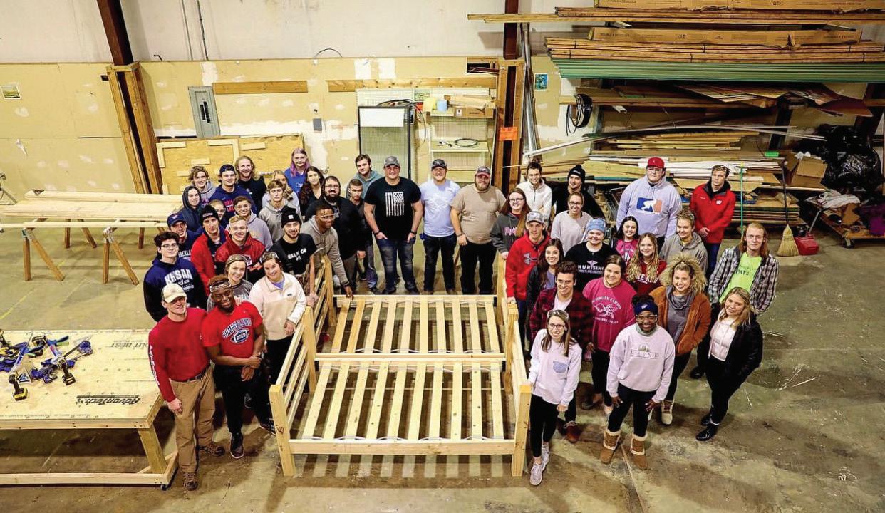Right: UC students gather around two bedframes that were assembled on the service day.