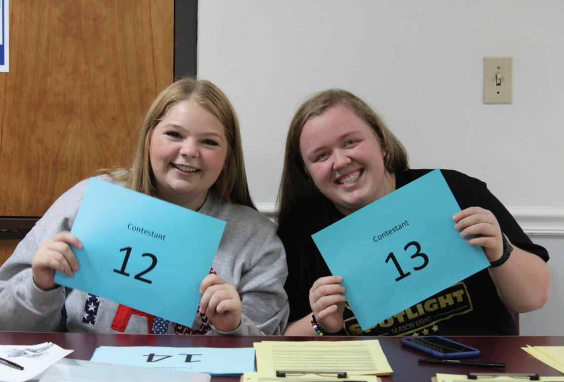 Right top photo: Molly Malone and Hallie Brackett hold bid numbers meant for persons auditioning.
