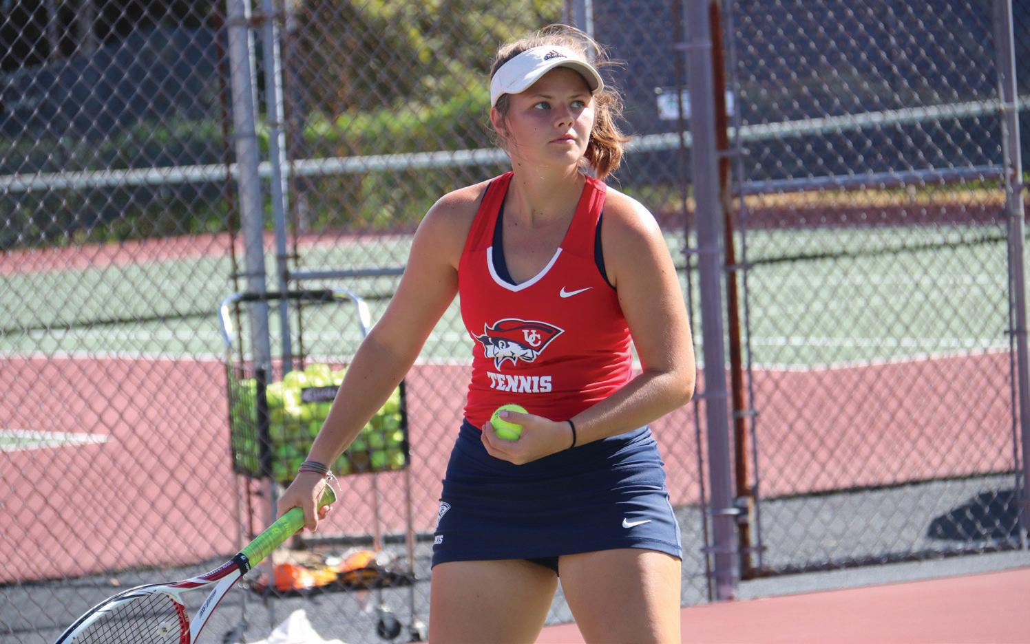 Jaclyn Jewel, UC tennis captain, says, âI have for sure seen a tremendous growth in our team since the fall. We are more of a together team and love each other greatly, this helps because in our matches we trust one another and encourage each other through thick and thin.â