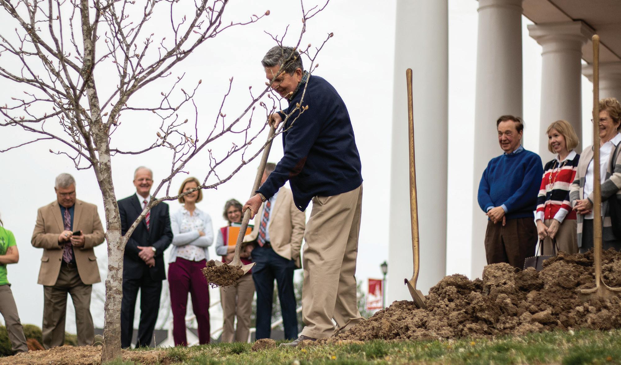 Mr. Raymond M. Sutton Jr., UC alumni and member of the Magnolia Society International, shovels soil into the newly planted red buckeye tree on the front lawn of the Correll Science Complex