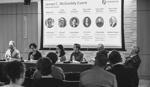 Fordham University’s department of Arts & Sciences recognized five faculty members at the James C. McGroddy Award Ceremony for Innovation in Education on Nov. 4. The event featured a panel discussion with award winners, moderated by Judith Jones, associate professor of philosophy. Panelists reflected on teaching, interdisciplinary collaboration and celebrated how Fordham’s faculty shapes the academic and personal growth of students. The ceremony is named for James. C. McGroddy, Ph.D., a distinguished Fordham donor in climate sciences.