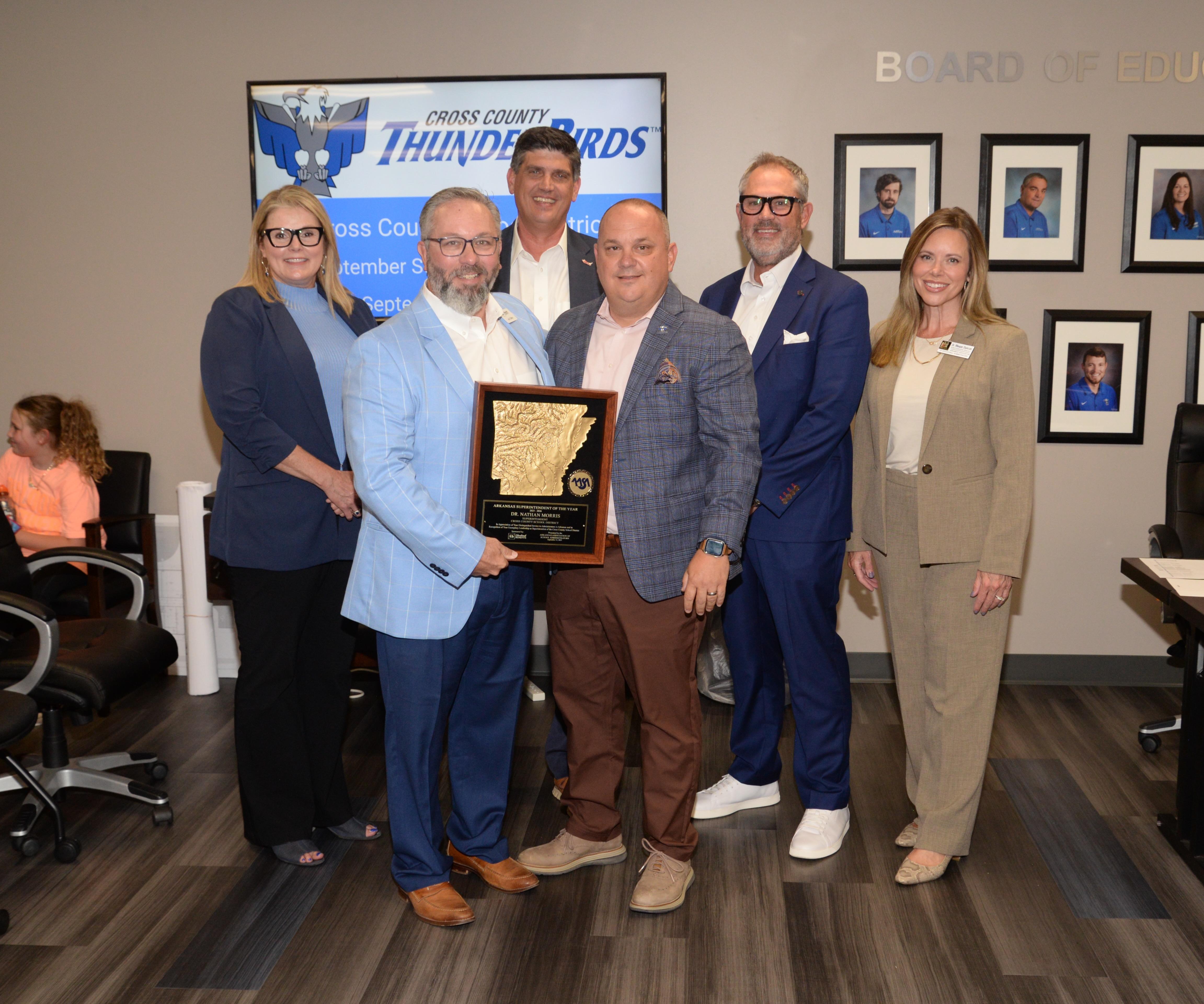 Dr. Nathan Morris, Superintendent of Cross County School District, was recently presented with the 2026 Arkansas Superintendent of the Year Award. This award is sponsored by Educational Benefits, Inc. Dr. Megan Duncan, Executive Director of the Arkansas Association of Educational Administrators (AAEA), and Jon Collins, Educational Benefits, Inc., presented him with the award at the Cross County School District on September 15.