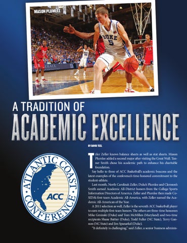 yler Zeller knows balance sheets as well as stat sheets. Mason Plumlee added a second major after visiting the Great Wall. Tanner Smith chose his academic path to enhance his charitable foundation. Say hello to three of ACC Basketball’s academic beacons and the latest examples of the conference’s time-honored commitment to the student-athlete. Last month, North Carolina’s Zeller, Duke’s Plumlee and Clemson’s Smith earned Academic All-District honors from the College Sports Information Directors of America. Zeller and Plumlee then made CoSIDA’s first-team Academic All-America, with Zeller named the Academic All-American of the Year. A 2011 selection as well, Zeller is the seventh ACC basketball player to earn multiple first-team honors. The others are three-time honorees Mike Gminski (Duke) and Tom McMillen (Maryland) and two-time recipients Shane Battier (Duke), Todd Fuller (NC State), Terry Gannon (NC State) and Jim Spanarkel (Duke). “It definitely is challenging,” said Zeller, a senior business adminis-