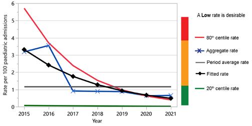 In 2021 there were 107 submissions from 10 HCOs for nine CIs. Of the seven indicators which had a desirable level specified as ‘High’ or ‘Low’ and sufficient data (minimum of four years) to test for trend: