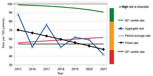 In 2021 there were 769 submissions from 104 HCOs for six CIs. Of the two indicators which had a desirable level specified as ‘High’ or ‘Low’ and sufficient data (minimum of four years) to test for trend