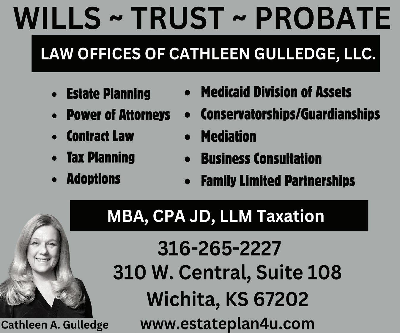 Arlene Burrow ................................................................................ 316-789-0909 arleneburrow.com Cathleen Gulledge ......................................................................... 316-265-2227 estateplan4u.com Elder Law Hotline .......................................................................... 888-353-5337
