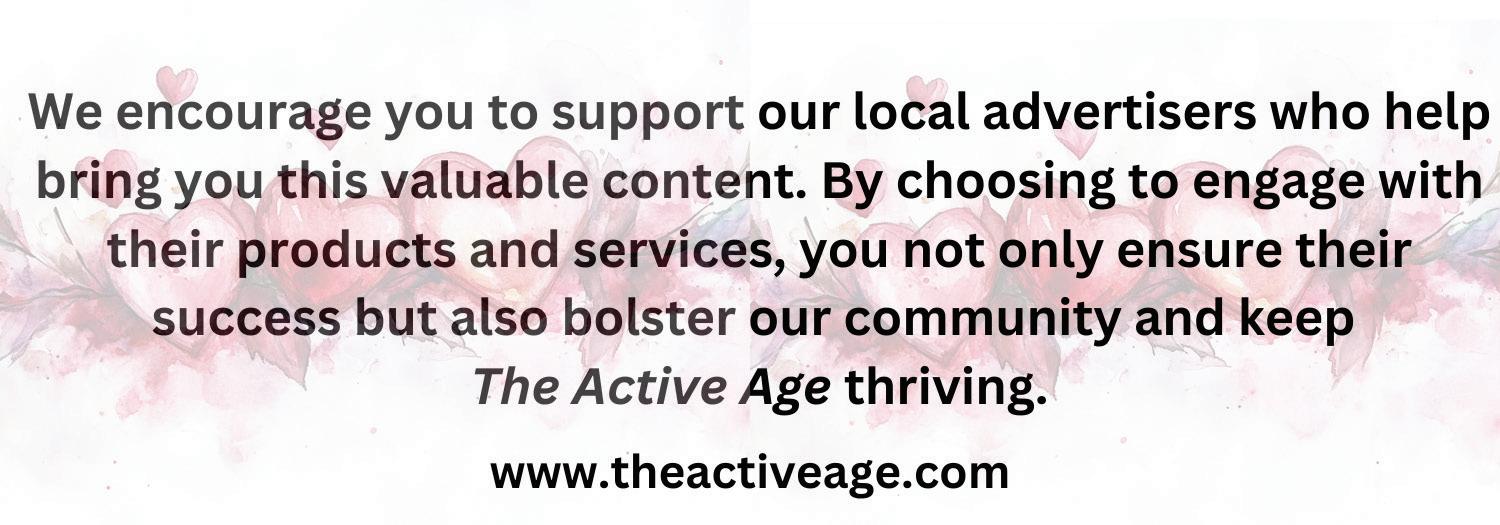 Dear Reader, no words can express our gratitude for your devotion. Each time you open our pages, you reaffirm our purpose. Without you, we could not exist. Happy Valentine’s Day – from The Staff and Board of The Active Age.