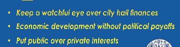 Restore public confidence in City Hall by providing competent oversight to taxpayer funds. Spending priorities need to shift away from developers and back to the public. Provide passionate leadership in a cooperative approach to inspire pride in our great community.