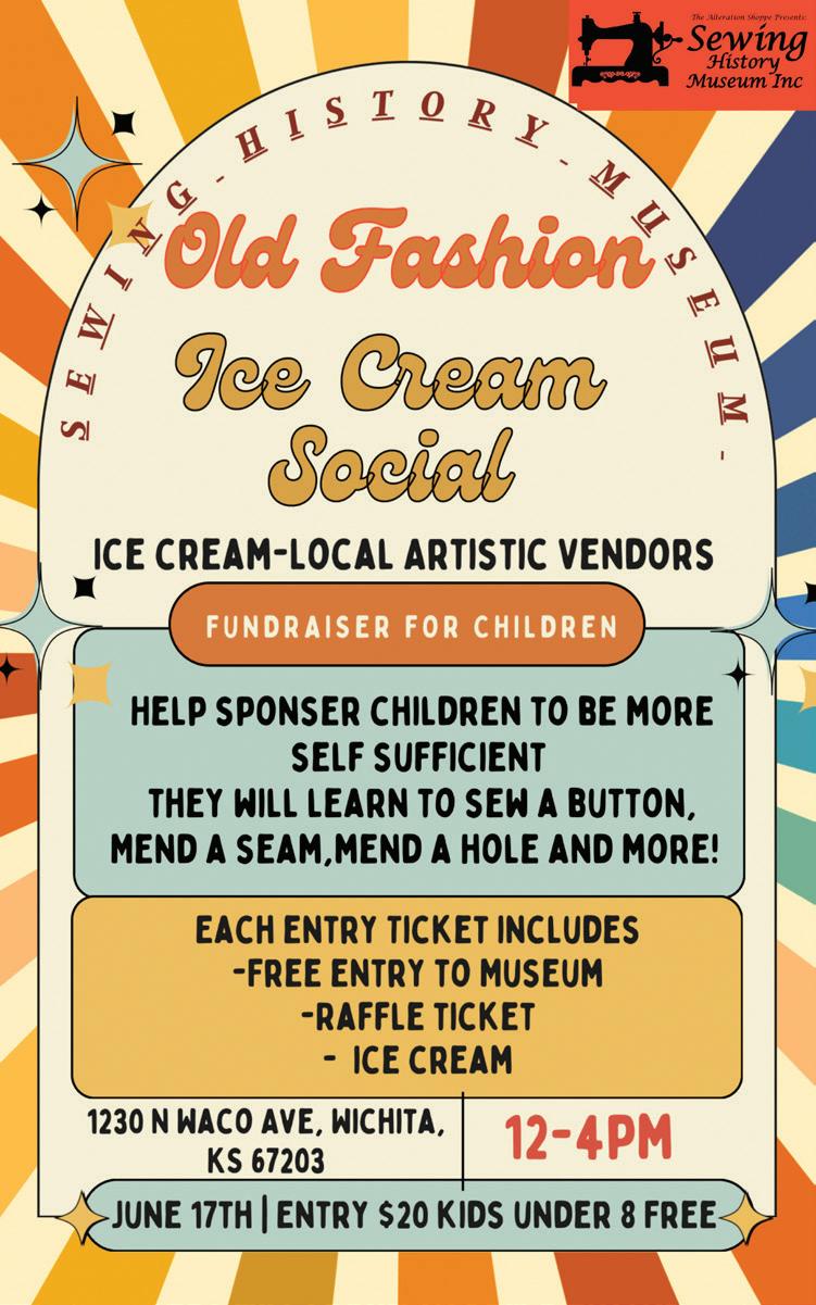 The Wichita Sewing Museum is hosting an old-fashioned ice cream social from noon to 4 p.m. on Saturday, June 17. Tickets are $20, with kids eight and under free. The ticket includes entry to the museum, a raffle, ice cream and access to vendors. Proceeds will help sponsor sewing lessons for children at the museum.