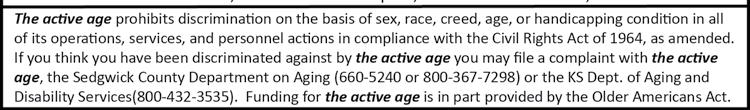 theactiveage.com; by mail to The Active Age, 125 S. West St., Suite 105, Wichita, KS, 67213; or in person at the same address.