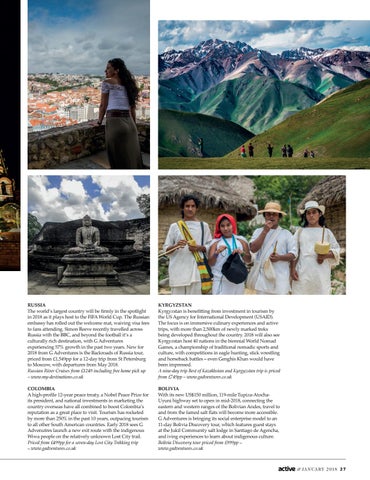 RUSSIA The world’s largest country will be firmly in the spotlight in 2018 as it plays host to the FIFA World Cup. The Russian embassy has rolled out the welcome mat, waiving visa fees to fans attending. Simon Reeve recently travelled across Russia with the BBC, and beyond the football it’s a culturally rich destination, with G Adventures experiencing 57% growth in the past two years. New for 2018 from G Adventures is the Backroads of Russia tour, priced from £1,549pp for a 12-day trip from St Petersburg to Moscow, with departures from May 2018. Russian River Cruises from £1249 including free home pick up – www.my-destinations.co.uk