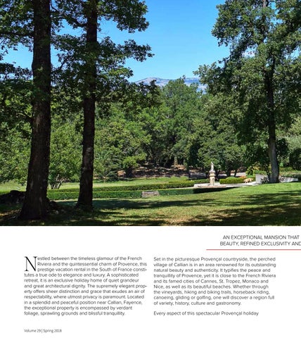 estled between the timeless glamour of the French Riviera and the quintessential charm of Provence, this prestige vacation rental in the South of France constitutes a true ode to elegance and luxury. A sophisticated retreat, it is an exclusive holiday home of quiet grandeur and great architectural dignity. The supremely elegant property offers sheer distinction and grace that exudes an air of respectability, where utmost privacy is paramount. Located in a splendid and peaceful position near Callian, Fayence, the exceptional property is encompassed by verdant foliage, sprawling grounds and blissful tranquillity.